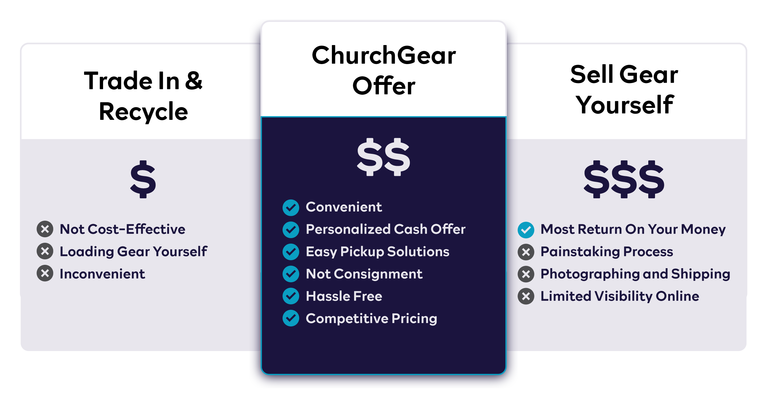 ChurchGear doesn't buy gear at the highest price it can be sold. You can make the most money by selling it yourself. We will list those steps below. The value we provide is a solution to sell it all at once, reclaim your closet space, and finally mark “sell our old gear” off your to do list.